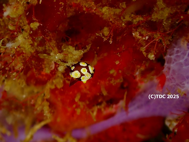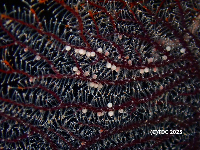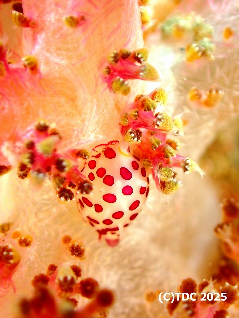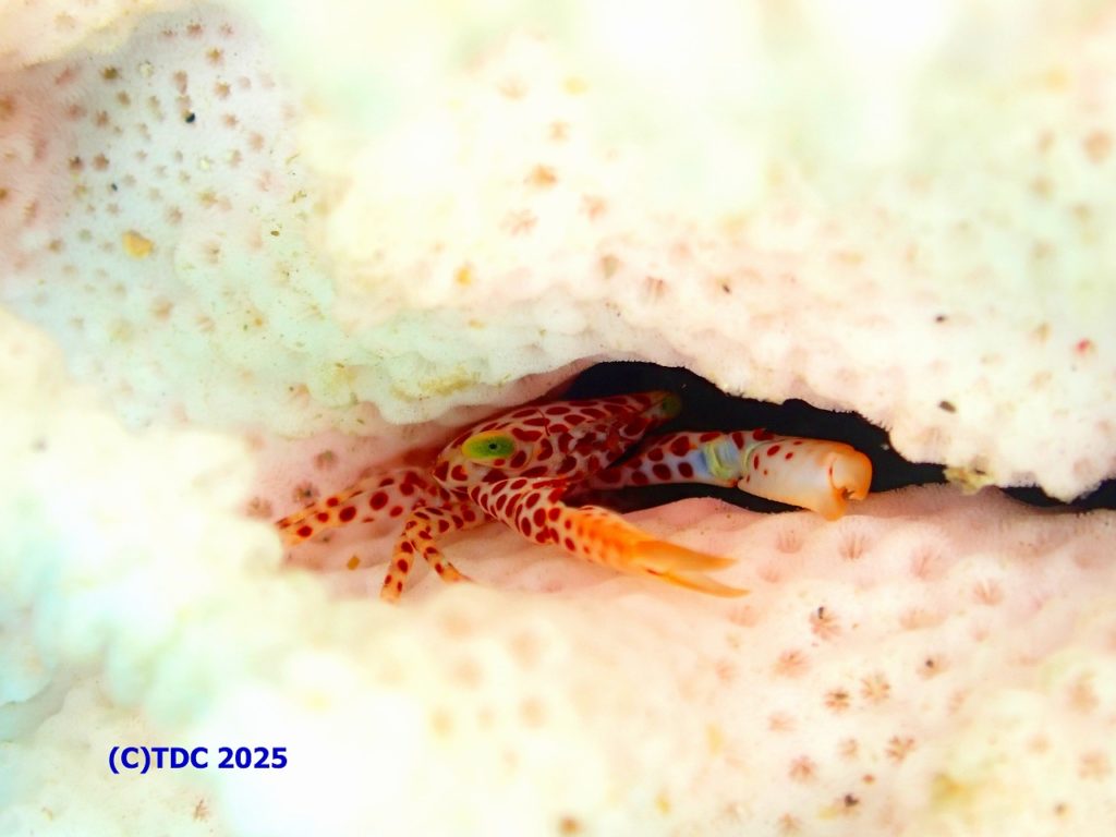 食巻貝に食べられたサンゴに住むオオアカホシサンゴガニ 12月9日