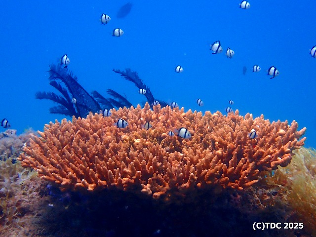 ソラスズメダイやフタスジリュウキュウスズメダイの幼魚が一気に増えて見栄えのある体験ダイビングになってます!