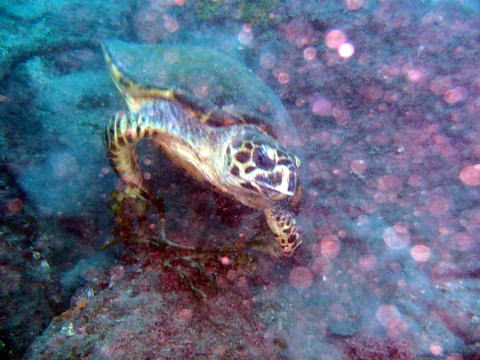 エントリーしてすぐに頭隠して尻隠さずのウミガメが。でも微動だにせず。脚をつっついても反応なしで。もしや反応なし?と甲羅をたたいて「大丈夫ですか」でも反応なしで、岩の奥の顔をライトを当ててみていると突然!