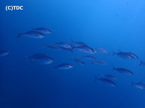 船から見て回遊魚がいるのが分かるぐらい水面が騒がしくて潜るのがワクワクする時期です。今日は特大のカンパチの群れがキビナゴの群れを狙っていました。