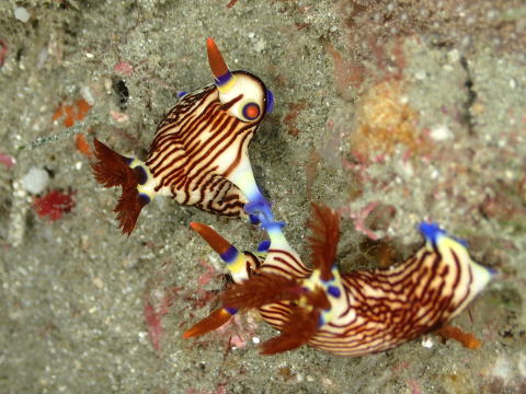 2匹のクロスジリュウグウウミウシが手をつないでグルグル回っているみたいです。