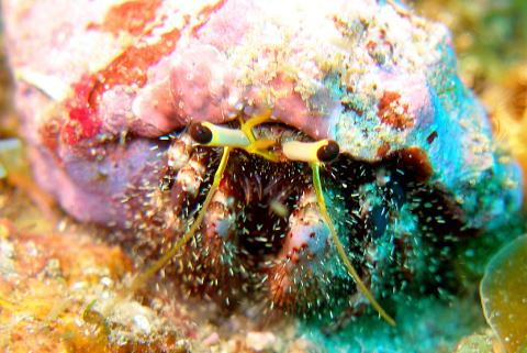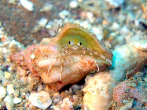 宿にする貝殻は、多種多様。アクギカイ科を始めスイジガイ、イモガイ、ゴホウラ、ギンタカハマなど、殻口の狭い貝でも宿にする。