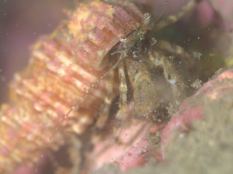 はさみ脚と歩脚には、ピンクの斑紋が見られ、各節に白色の横縞も見られる。