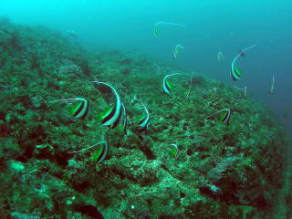 メジナの群れ、シマアジの群れ、カゴカキダイの群れ、タテジマキンチャクダイ、サザナミヤッコ、イシガキダイなど中層がとっても賑やかになってきました!岩礁にはサラサゴンベやモヨウモンガラドオシやタコ、イセエビ、ヘラヤガラなども見られましたよ。