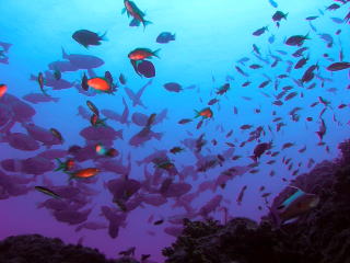 派手なところでは、タテジマキンチャクダイ、サザナミヤッコ、ヒブダイ、モンガラカワハギといった面々がお目見え。
